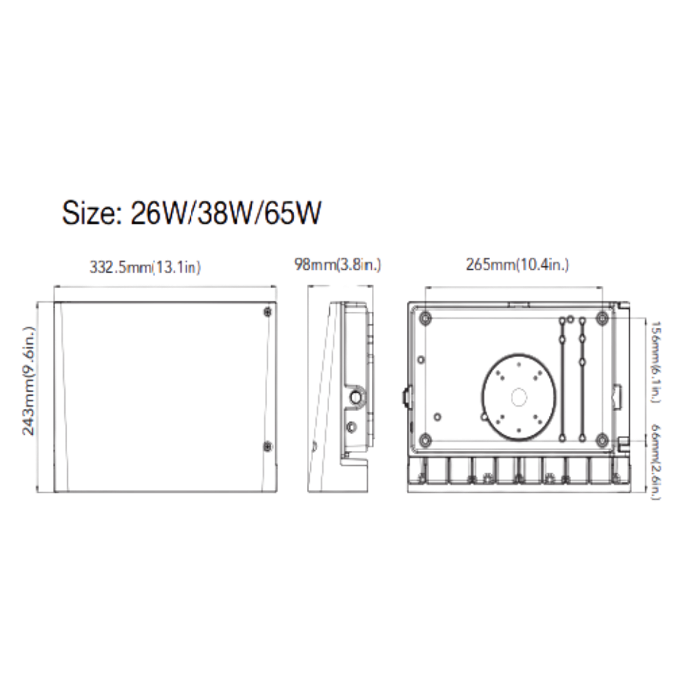 Potencias: 26W / 38W / 65W / 135W Eficiencia: >140 lm/W CRI: 70 CCT: 3000K / 4000K / 5000K Dimming: 1-10V, PWM Montaje: Muro, pared IP65, IK08 Acabado: Bronze, Negro, A solicitud