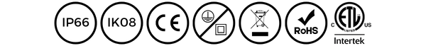 Potencias: 20W / 30W / 40W Eficiencia: >140 lm/W CCT: 3000K / 4000K / 5000K CRI: 70 Ópticas: 15°, 30°, 60°, elípticas Montaje: Brazo ajustable o abrazadera Dimming: 1-10V / PWM IP66, IK08 SPD: 10kV