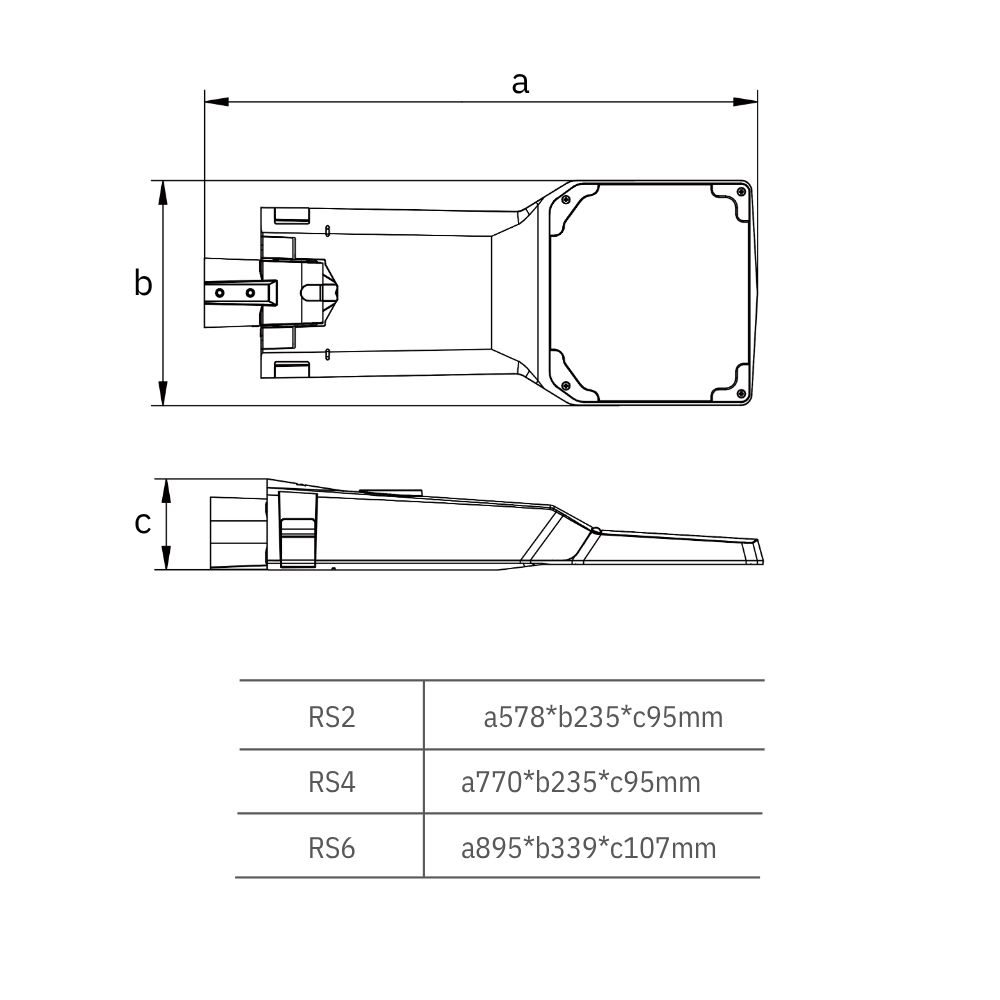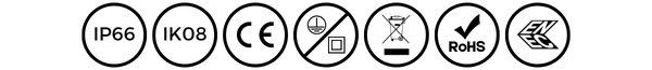 Potencias: 320W Flujo luminoso: hasta 7800 lm CCT: 2700K / 3000K / 4000K CRI: 80 Dimming: 1-10V, PWM Ópticas: 15°, 30°, 60° IP66, IK08 Montaje: Soporte mural o columna Acabados: Negro / gris