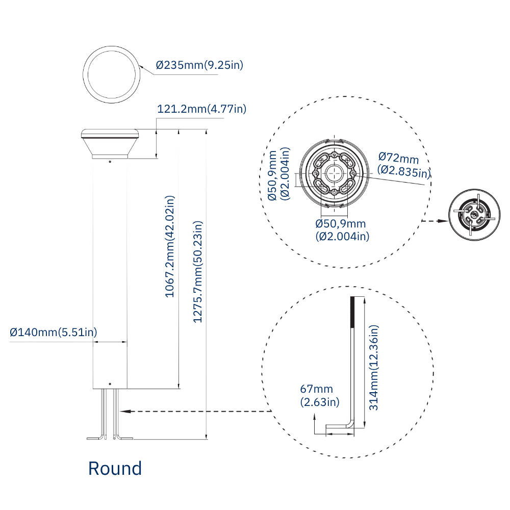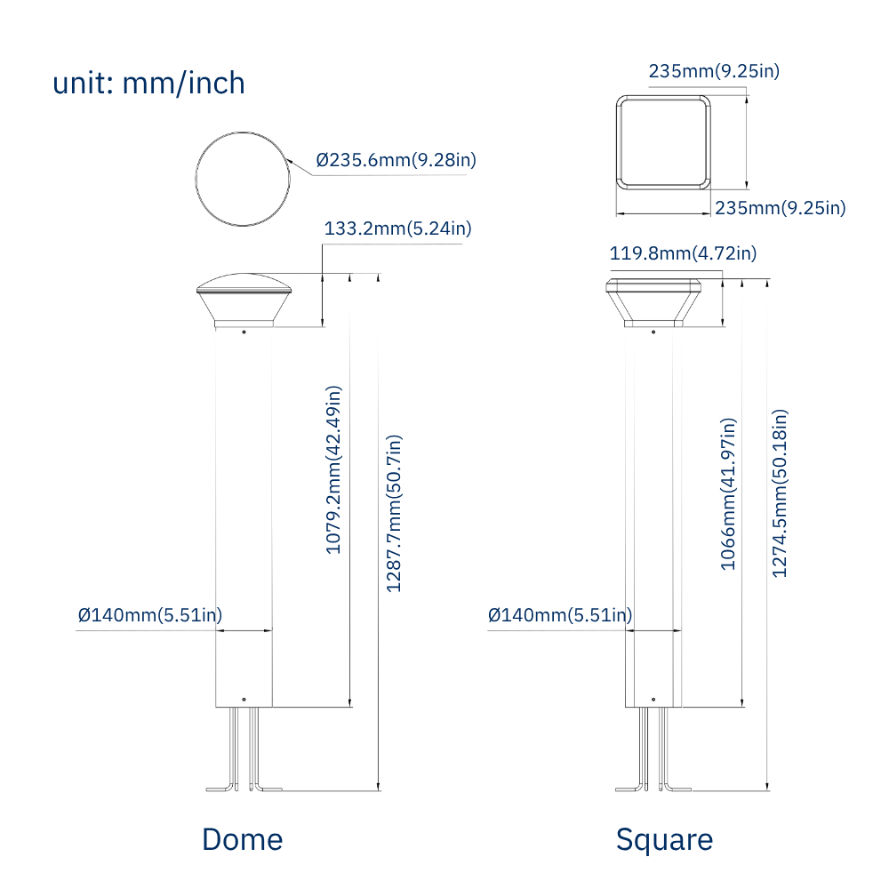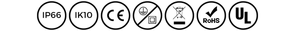 Potencias: 14W / 19W / 24W Flujo: hasta 3120 lm Eficiencia: >130 lm/W CCT: 3000K / 4000K / 5000K CRI: 80 Dimming: 0-10V IP66, IK10 Montaje: Poste corto o muro Opciones: Redondo / cuadrado / domo